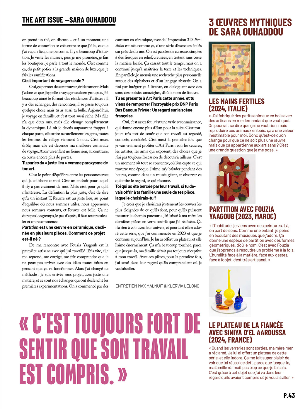 Le Prix BNP Paribas Banque Privée – « Un regard sur la scène française » récompense le parcours d’un artiste vivant de la scène hexagonale. À travers ce prix, BNP Paribas Banque Privée soutient la carrière d’un artiste tout en valorisant le travail de sa galerie dans la promotion de ses œuvres et le développement de son rayonnement. La lauréate de cette troisième édition du prix a été choisie parmi 16 nommés issus de la sélection du commissaire invité de l’édition 2026, Loïc le Gall, directeur du centre d’art contemporain la Passerelle à Brest, dans le cadre de son parcours thématique Babel – Art et langage en France. Selon le commissaire invité Loïc Le Gall, Sara Ouhaddou explore le langage comme un système de signes inscrit dans des histoires culturelles, sociales et politiques souvent situées à la marge des récits dominants. À travers la céramique, la sculpture, l’installation ou le dessin, l’artiste interroge la manière dont les formes, les motifs et les gestes circulent entre les cultures, se transforment, se transmettent ou disparaissent.