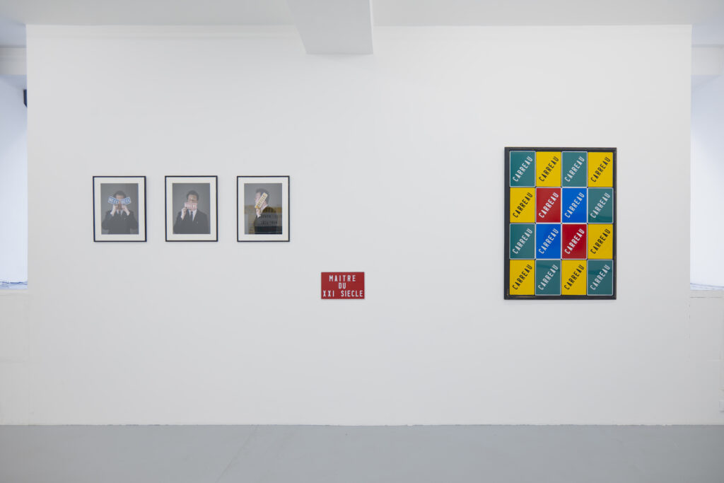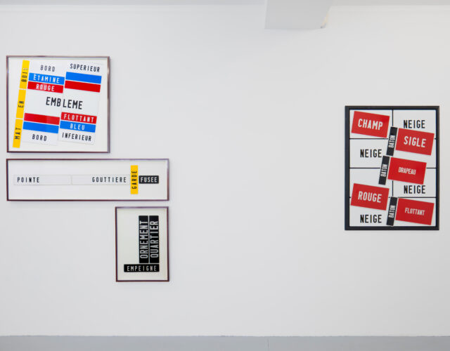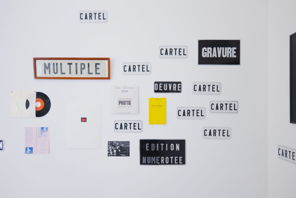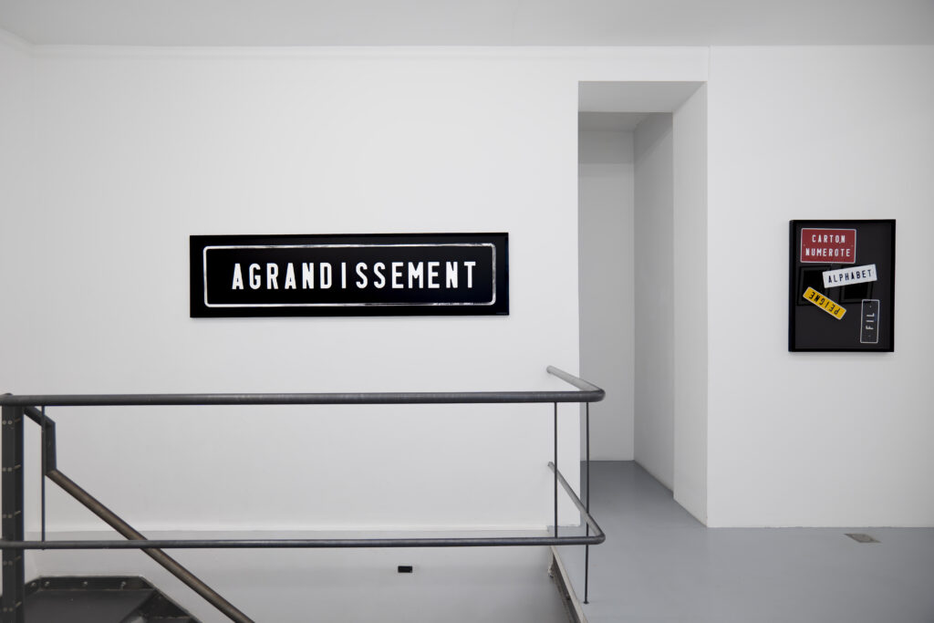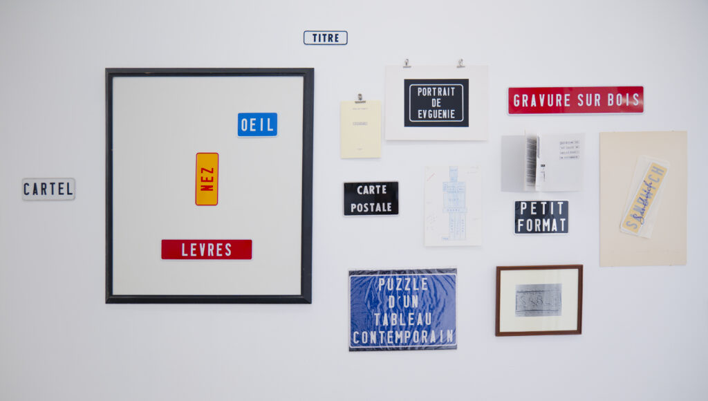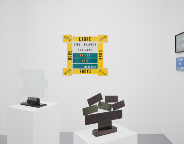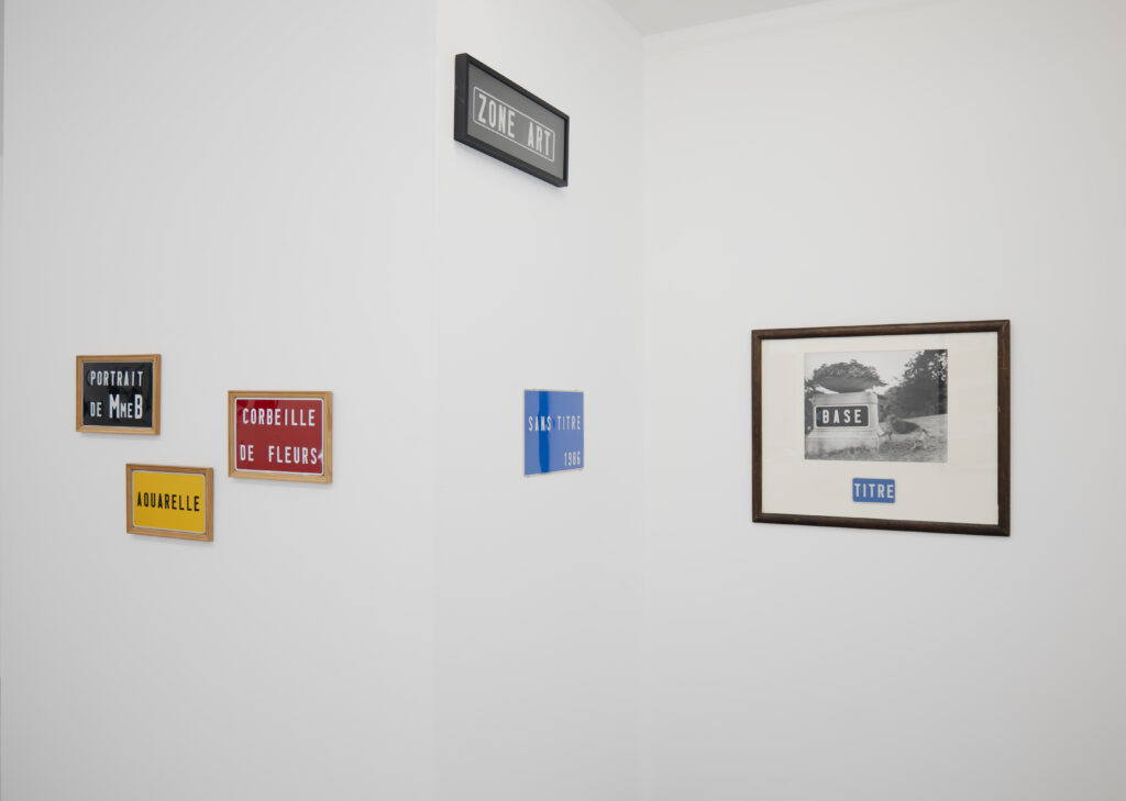Portrait, paysage, nature morte : les genres classiques de l’histoire de l’art sont démontés puis réassemblés en unités verbales, disséminées dans l’espace d’exposition comme des éclats d’une réalité absente. L’art se regarde aussi lui-même, l’artiste le met en abîme, ŒUVRE, ŒUVRE NON ENCADRÉE, ŒUVRE ENCADRÉE, PHOTO, GRAVURE SUR BOIS, TITRE, PETIT FORMAT, MULTIPLE, LISTE DES PRIX, CARTEL de Ben, CARTEL de Rebecca Horn, CARTEL de Joseph Beuys… C’est ainsi que se découvrent les collections et les textes inédits dans de petits livres compagnons d’une plaque ; il y a aussi les coupes de fruits et les cannettes, les repas organisés par la galerie par le MENU. Un mot une plaque une couleur, des plaques des mots des peintures. L’artiste décline mots plaqués, images et peintures, le galeriste pense les productions et les éditions, ils jouent des multiplications.