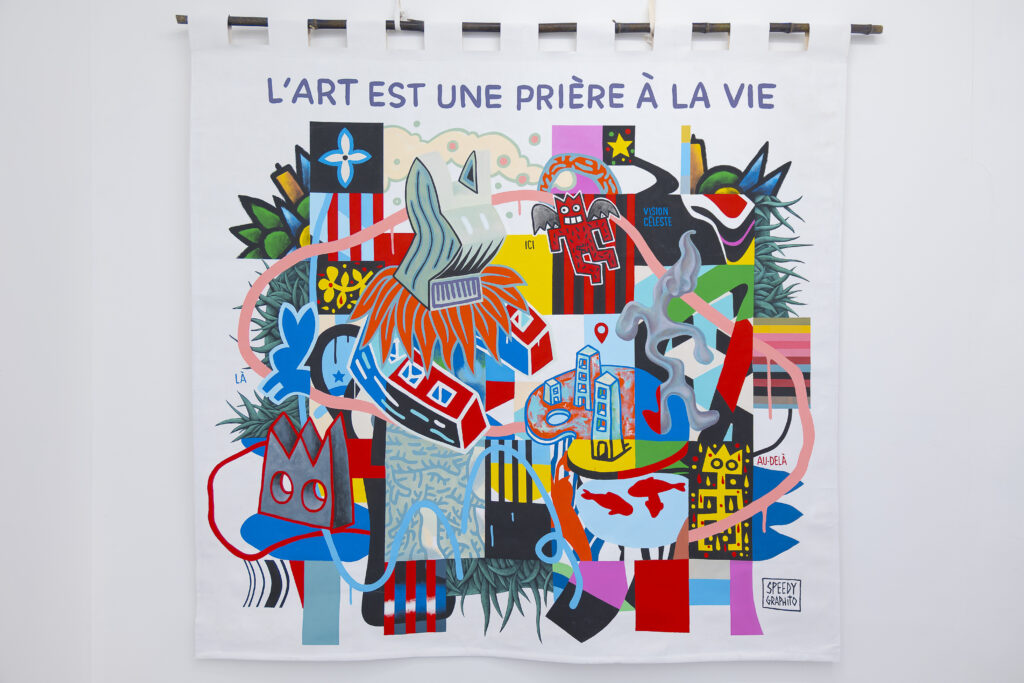 Toujours hanté par cette nécessité intérieure de l’artiste, Speedy Graphito a toujours été libre d’agir comme il le souhaite. S’étant toujours affranchi de l’obligation de représentation, cet ex marginal de la société, a su s’intégrer consciemment dans le monde de l’art en habitué de l’image médiatique et de l’histoire. Il ne s’agit plus de reproduire la réalité visible, mais de libérer la figuration de toutes ses contraintes.